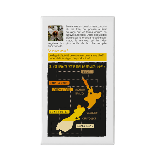 Le miel de Manuka possède une activité unique qui le différencie des autres miels : l’activité non peroxydique, mesurée par l’indice IAA « Indice d’Activité et d’Authenticité », Le taux de methylglyoxal (MGO) présent dans le miel est également en partie responsable de ces propriétés uniques. Ainsi, plus l'indice IAA est élevé, plus le miel sera actif.